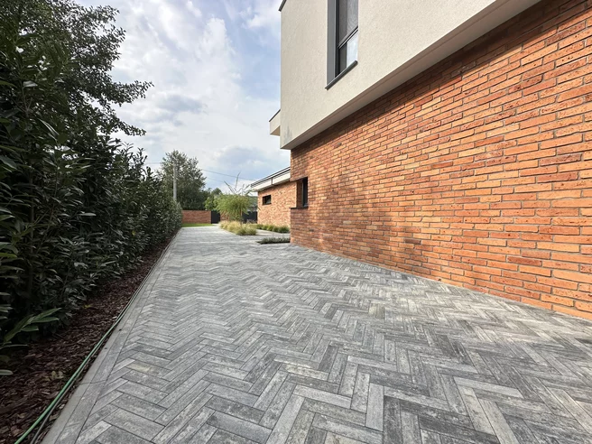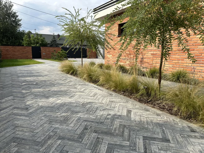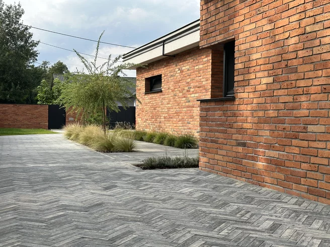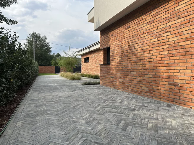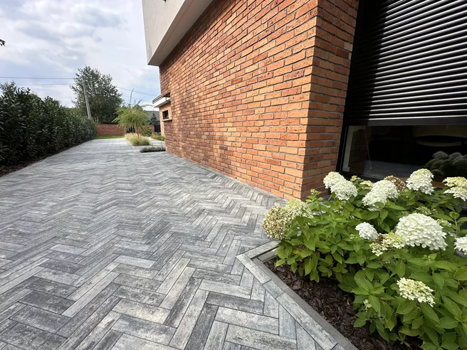 KOSTKA BRUKOWA METRIK jest idealna na nawierzchnie przed nowoczesnymi budynkami, podjazdy, ścieżki, umożliwiając układanie w różne wzory, w tym "jodełkę".