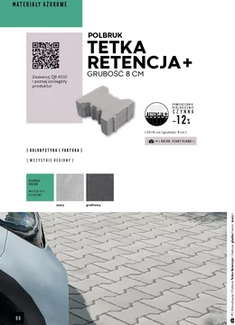 Kostka Ażurowa Tetka Retencja+ to nowa kostka z linii Retencja+, która doskonale sprawdzi się na parkingach i podjazdach. Przestrzeń biologicznie czynną wynoszącą 15% wyznaczają wypustki umieszczone na bokach kostek. Dzięki takim samym wymiarom jak nasza standardowa koska Tetka - 20x16 cm i grubości 8 cm, można je razem instalować w przestrzeni.